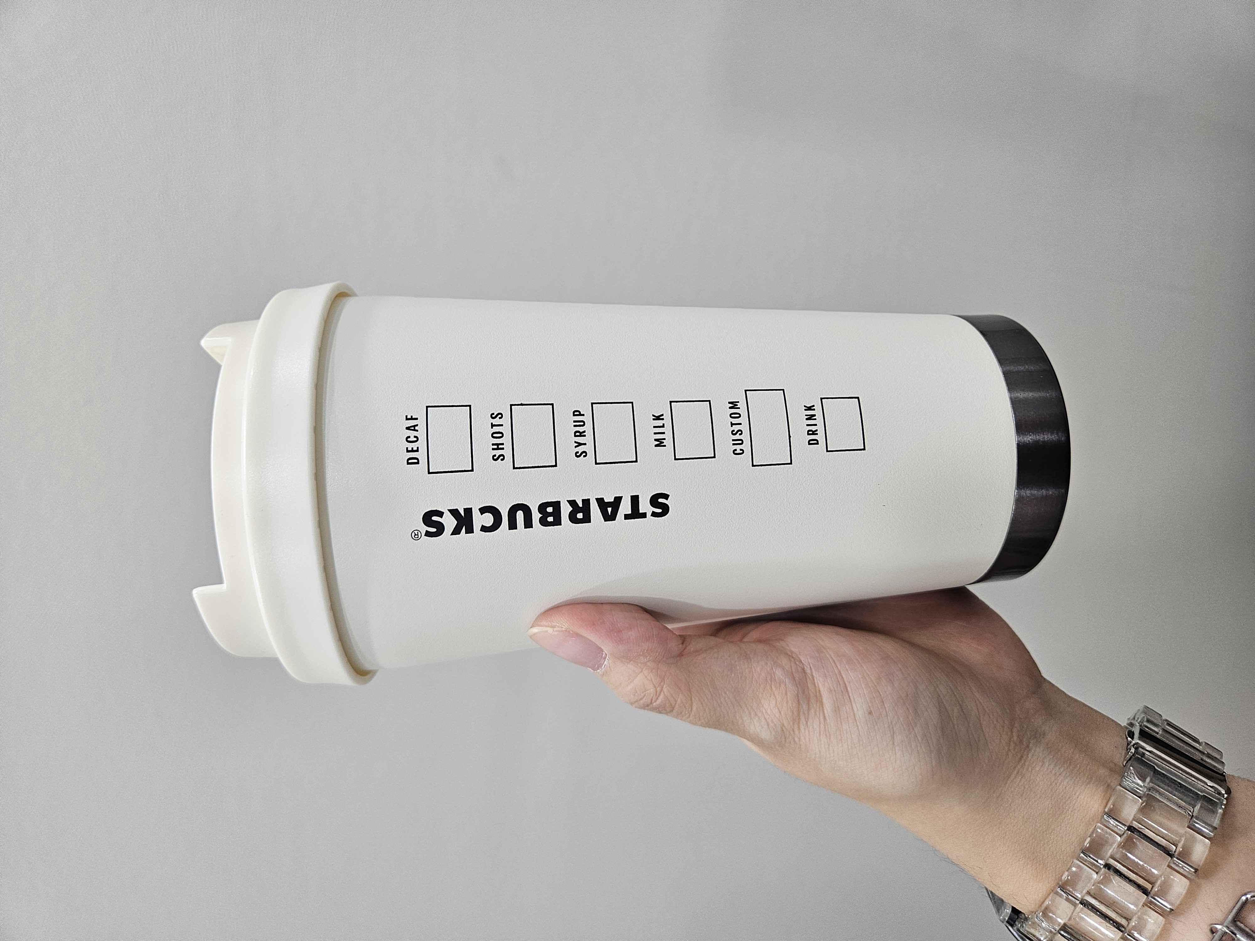 너무 예쁘네요ㅠㅠ♥︎ 일단 깔끔한 외관에 눈길이 갔던 것 같아요. 스타벅스 핫 컵에서 영감을 받은 모델이라고 하는데요, 실제로 보면 정말 유사한 느낌이 듭니다. 그란데 사이즈라서 한 손에 잡기도 좋고 그렇게 무겁지 않아 사용이 좋을 것 같았습니다.