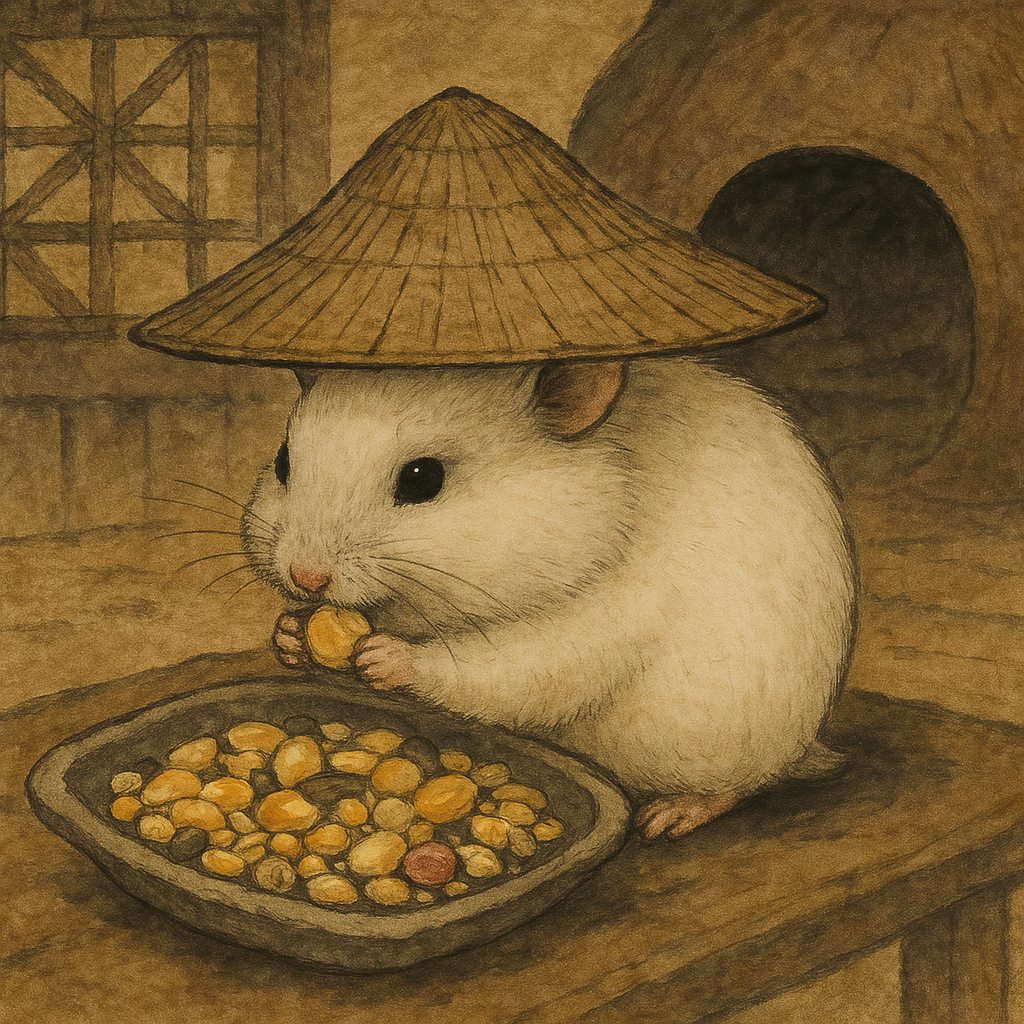 마지막으로 옥수수 먹는 햄스터입니다. 머리에 삿갓도 올리면 귀여울 것 같아서 문구를 추가해서 만들어봤습니다. 주막같은 곳에서 옥수수를 먹는 느낌으로 해달라고 했더니 이렇게 열심히 먹고 있는 모습입니다 :)
